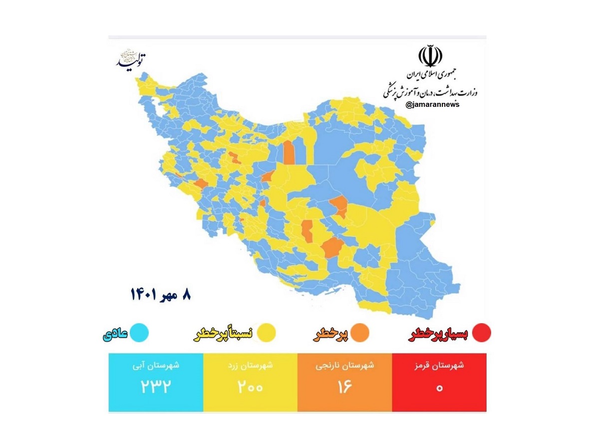 وزارت بهداشت آخرین وضعیت رنگ بندی شهرها از لحاظ همه گیری کرونا را امروز نهم مهر 1401 اعلام کرد.