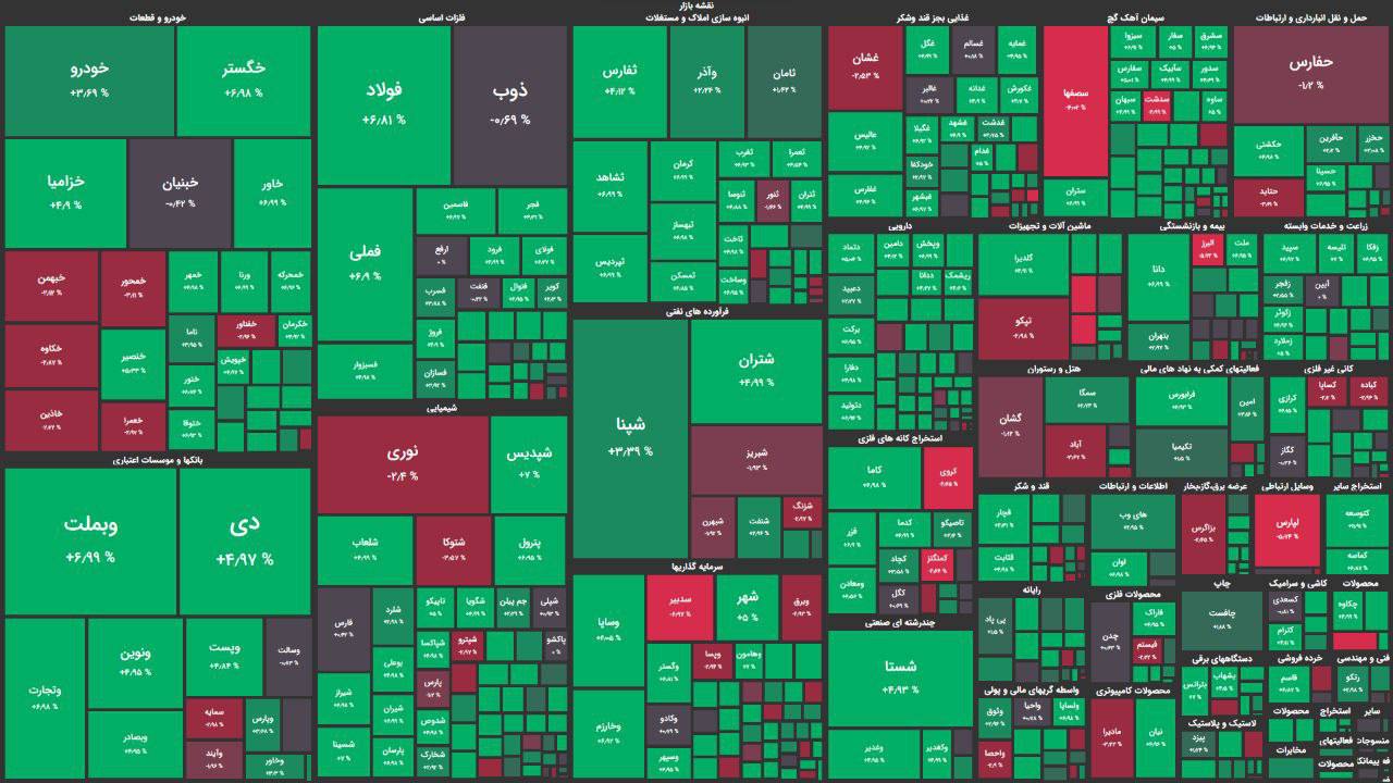 طبق گزارش ایسنا، شاخص کل بورس امروز با ۴۳ هزار و ۱۲۲ واحد صعود تا رقم یک میلیون و ۹۹۹ هزار واحد افزایش یافت. شاخص کل با معیار هم‌وزن نیز ۱۵ هزار و ۴۹۸ واحد صعود کرد و در رقم ۷۰۳ هزار و ۲۵۱ واحد ایستاد. در این بازار ۴۳۰ هزار معامله به ارزش ۷۱ هزار و ۵۷۴ میلیارد ریال انجام شد. طی معاملات امروز ۸۴ درصد نمادهای بورسی مثبت بودند که از میان آن‌ها فولاد مبارکه اصفهان، ملی صنایع مس ایران و سرمایه‌گذاری تامین اجتماعی نسبت به سایر نمادها بیشترین تاثیر مثبت را روی بورس گذاشتند.
