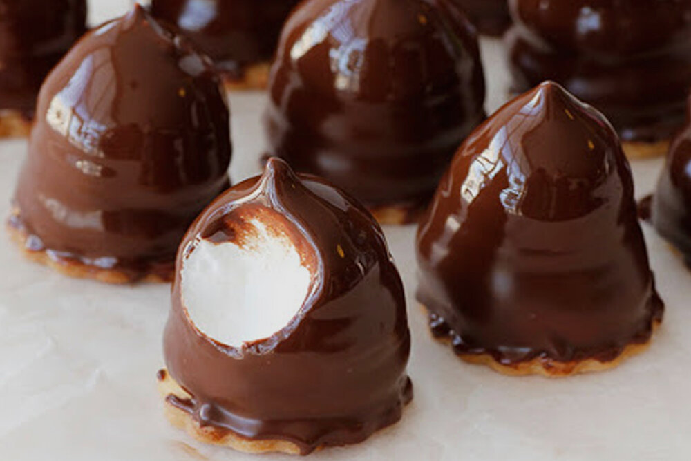 حالا شکلات ها را در یک ظرف استیل بریزید و روی حرارت غیر مستقیم قرار دهید تا آب شود، بستنی ها را از یخچال بیرون بیاورید و شکلات آب شده را روی آن بریزید.