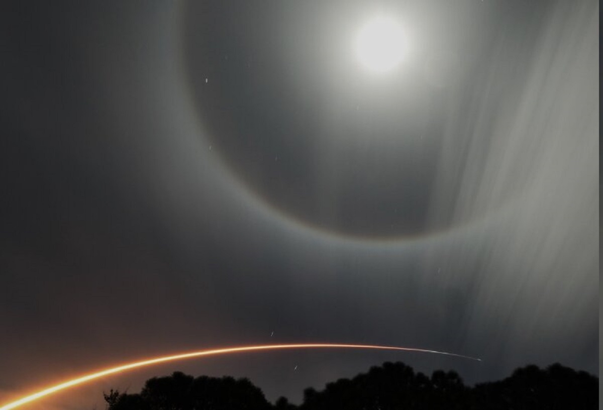 جی پلاس؛ خبرآنلاین نوشت: اندکی بعد از پرتاب موشک فالکون ۹ اسپیس ایکس از فلوریدا، این موشک از میان ابرهای کریستالی یخی عبور کرد و موقتا هاله‌ای از نور ایجاد کرد که به نظر می‌رسید این هاله کاملا ماه را در برگرفته است.