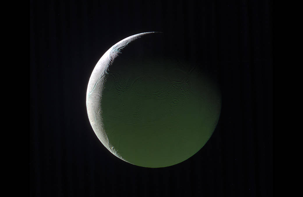 هلال باریک و روشن قمر انسلادوس در پس زمینه تاریک فضا، آن را اثیری و روحانی جلوه می دهد.