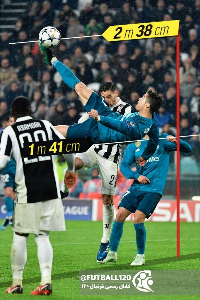 این گل رونالدو نکته آماری کم نداشت ولی مهم ترین آن قطعا پرش بی نظیر این فوق ستاره پرتغالی بود که همه را به حیرت واداشت. فاصله توپ با زمین در زمانی که رونالدو ضربه را زد دقیقا 2متر و 38 سانتی متر و فاصله پشت بدن و او با زمین 1متر و 41 سانتی متر بود.