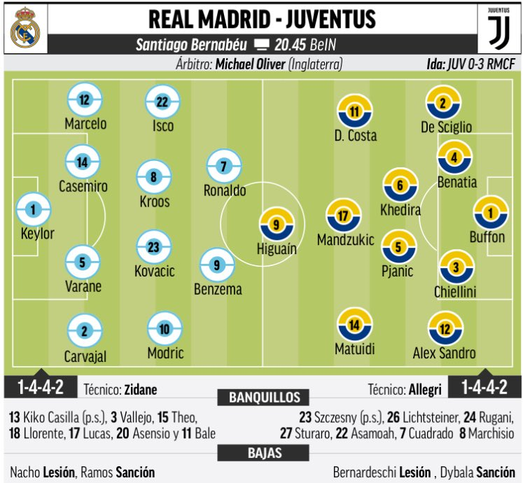 رئال: ناواس، مارسلو، کاسمیرو، واران، کارواخال، ایسکو، کوروس، کواچیچ، مودریچ، رونالدو و بنزما.