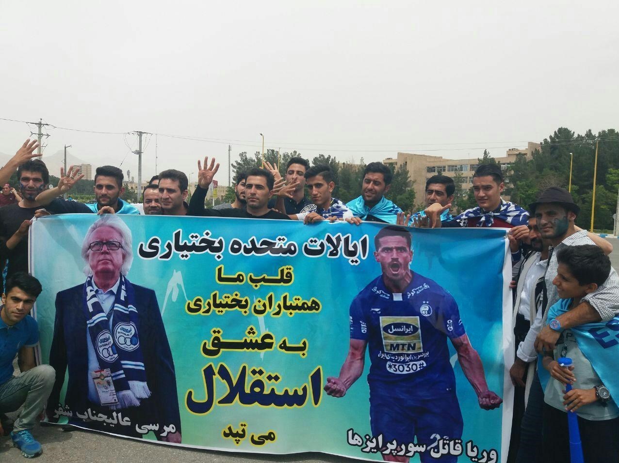 * تعدادی از هواداران بختیاری استقلال بنر بزرگی در دست دارند که روی آن تصاویری از وینفرد شفر و وریا غفوری و جملاتی در حمایت از آنها دیده می‌شود.
