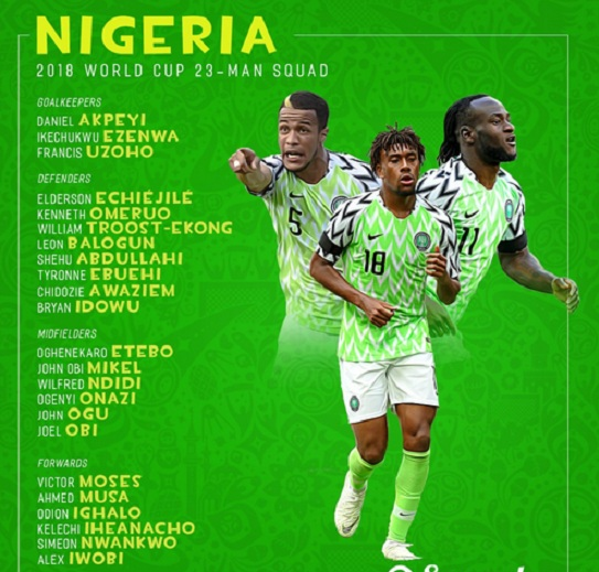 فهرست 23 نفره تیم ملی فوتبال نیجریه برای حضور در جام جهانی 2018 روسیه اعلام شد.