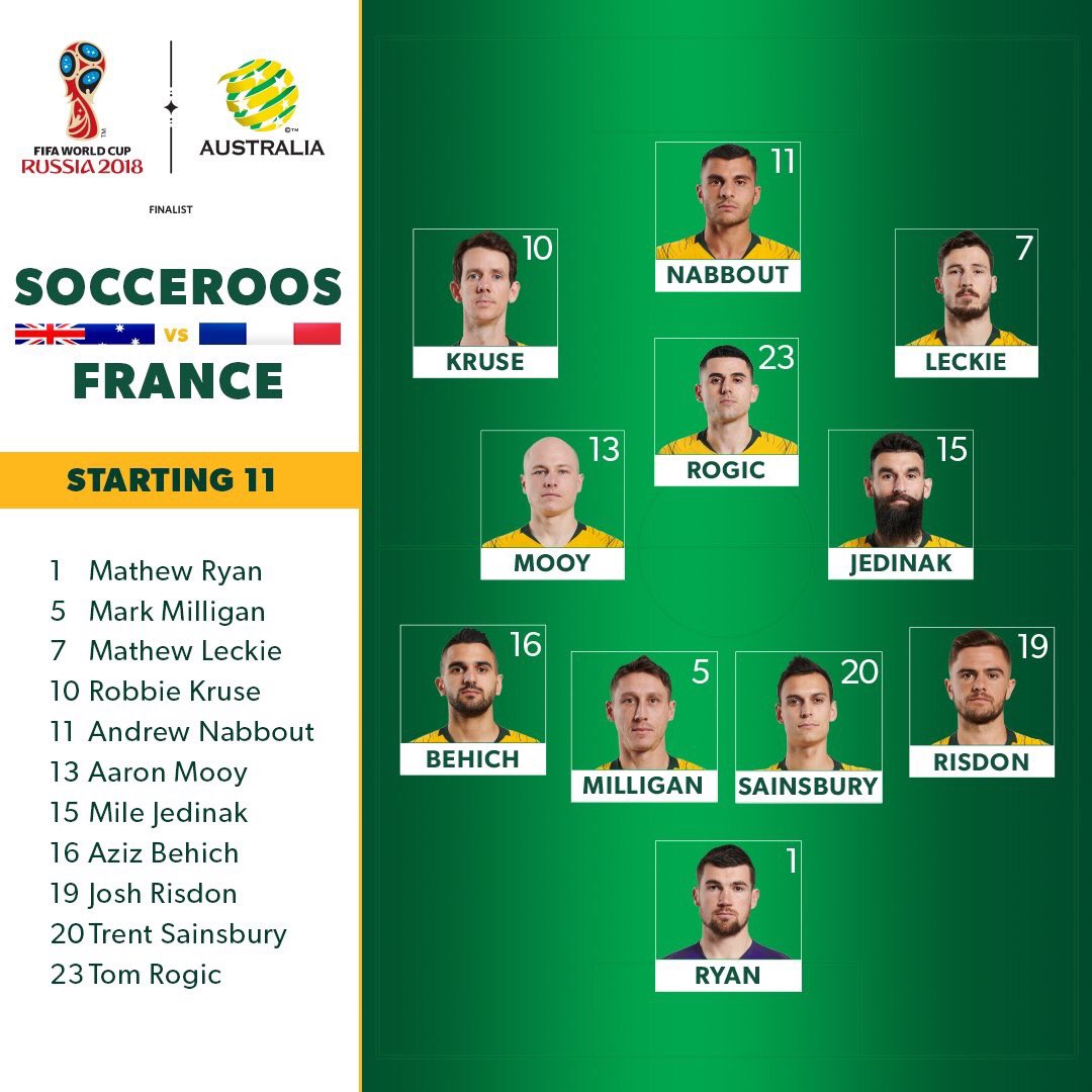ترکیب تیم ملی فوتبال استرالیا برای بازی امروز مقابل فرانسه در مرحله گروهی جام جهانی 2018 روسیه اعلام شد.