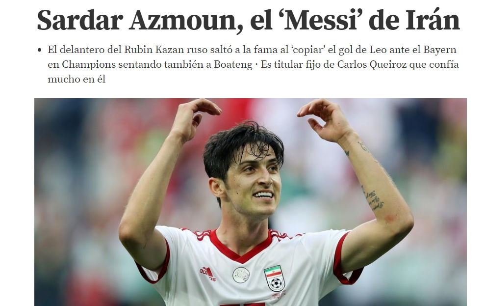 این نشریه اسپانیایی در ابتدا به آمار گلزنی سردار در تیم ملی ایران پرداخت و او را یکی از مهره های کلیدی کی روش معرفی کرد که مرد پرتغالی علی رغم آمار نه چندان خوب او در فصل اخیر اما از او در ترکیب اصلی خود استفاده می کند.