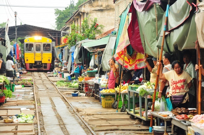 قطار شهری Maeklong در کشور تایلند در روز چند بار از وسط بازار دستفروش های میوه، سبزیجات و مرغ و ماهی عبور میکند.