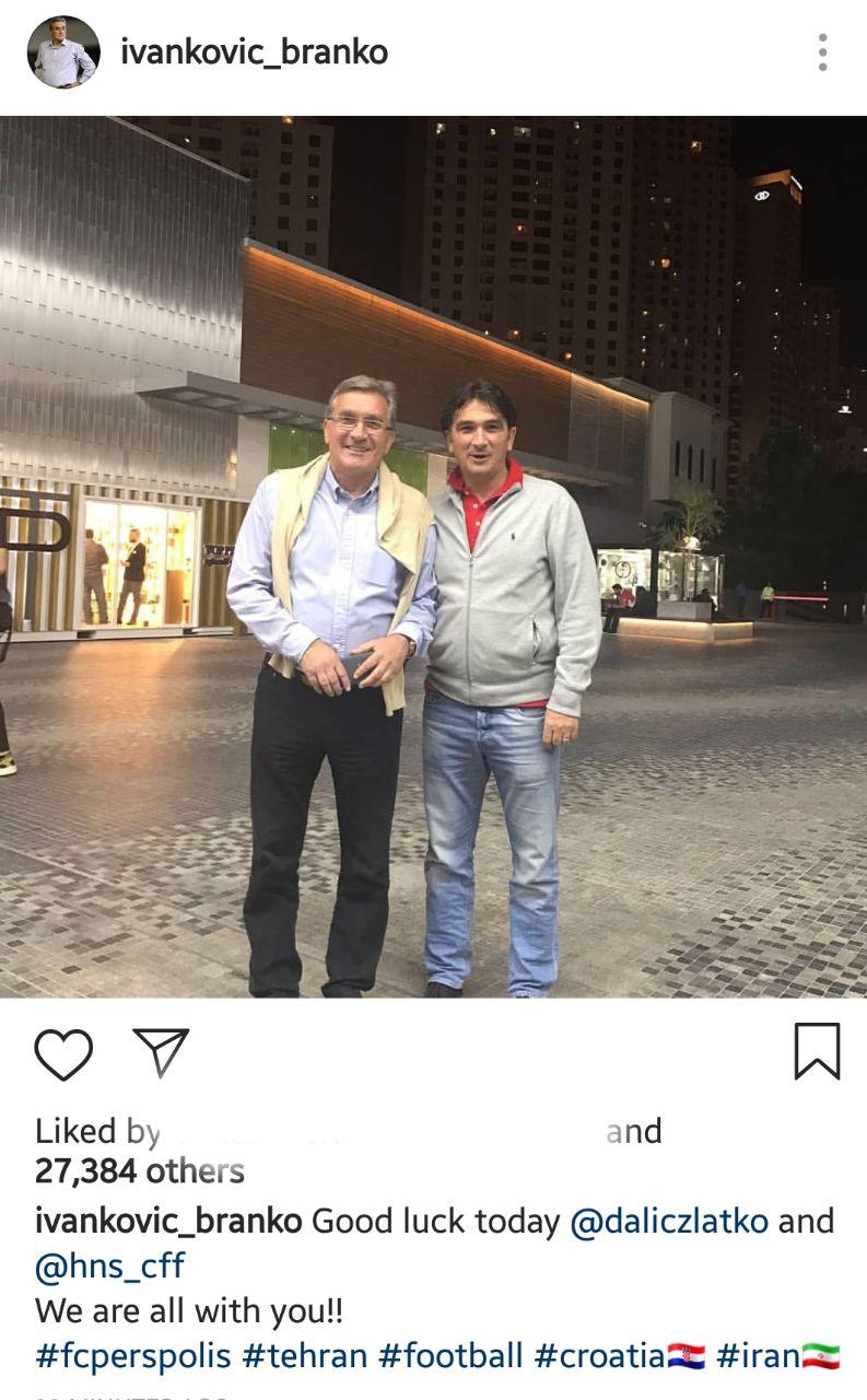 سرمربی کروات پرسپولیس که در دو فصل اخیر قهرمانی لیگ ایران را برای سرخپوشان پایتخت به ارمغان آورده، به عنوان یک نمونه موفق مربیان خارجی در فوتبال ایران شناخته می شود. او که اخیرا در ادامه درگیری هایش با کارلوس کی روش، وارد فاز مقایسه مربیان کروات با سایر کشورها هم شده، دقایقی پیش یک پست اینستاگرامی منتشر کرد و در ذیل عکس یادگاری خود با دالیچ، برای این مربی و تیم ملی کشور خود در دیدار نهایی مهم ترین تورنمنت جهان آرزوی موفقیت کرد.
