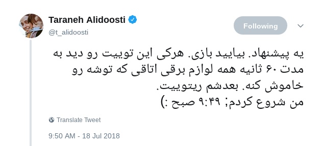 بازیگر «درباره الی» در توییتر نوشت: «یه پیشنهاد. بیایید بازی. هرکی این توییت رو دید به مدت ۶۰ ثانیه همه لوازم برقی اتاقی که توشه رو خاموش کنه. بعدشم ریتوییت. من شروع کردم; ۹:۴۹ صبح.»