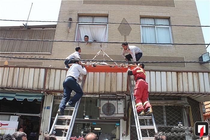 آتش نشانان با استفاده از تجهیزات مخصوص از جمله سبد نجات، نردبان دستی و طناب این بانوی آسیب دیده را با احتیاط از بالای تابلو تبلیغاتی مغازه به پایین منتقل کردند.