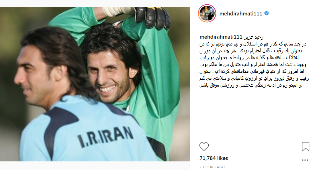 مهدی رحمتی کاپیتان تیم استقلال در واکنش به این خبر نوشت: وحید عزیز، در چند سالی که کنار هم در استقلال و تیم ملی بودیم برای من بعنوان یک رقیب، قابل احترام بودی. هر چند در ان دوران اختلاف سلیقه ها و گلایه ها در روابط ما بعنوان دو رقیب وجود داشت اما همیشه احترام و ادب متقابل بین ما حاکم بود. اما امروز که از دنیای قهرمانی خداحافظی کرده ای، بعنوان رقیب و رفیق دیروز برای تو ارزوی کامیابی و سلامتی می کنم و امیدوارم در ادامه زندگی شخصی و ورزشی موفق باشی.