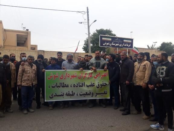 تعدادی از کارگران شهرداری شوش روز دوشنبه با حضور مقابل فرمانداری این شهرستان خواستار پرداخت حقوق معوقه و دیگر مطالبات خود شدند.