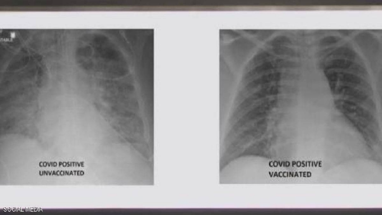 تصاویر اشعه ایکس نشان می‌دهد که ریه‌های فرد واکسینه نشده آلوده به ویروس کرونا تقریباً سفید بوده و به عنوان "تیرگی ریه" شناخته می‌شود، به این معنی که آن‌ها در این ویروس آغشته شده اند، در حالی که تصاویر ریه‌های فرد دیگر سفیدی کمتری دارد.
