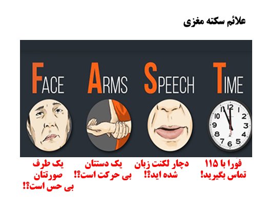 وی درباره راههای تشخیص سکته مغزی نیز گفت: کلمه FAST را به خاطر بسپارید و با این کلمه خود یا فرد مشکوک را آزمایش کنید و سکته مغزی را تشخیص دهید. F(face): از فرد مورد نظر بخواهید لبخند بزند. به دنبال علائم افتادگی صورت در یک سمت باشید A (Arms) . از بیمار بخواهید دست هایش را بالا ببرد. ببینید که آیا در بالا بردن یکی از آن ها دچار مشکل می شود یا خیر: s(speech). از او بخواهید یک عبارت را تکرار کندT(time) .: زمان را از دست ندهید. اگر فرد علائم سکته مغزی را داشت بلافاصله با اورژانس ۱۱۵تماس بگیرید.