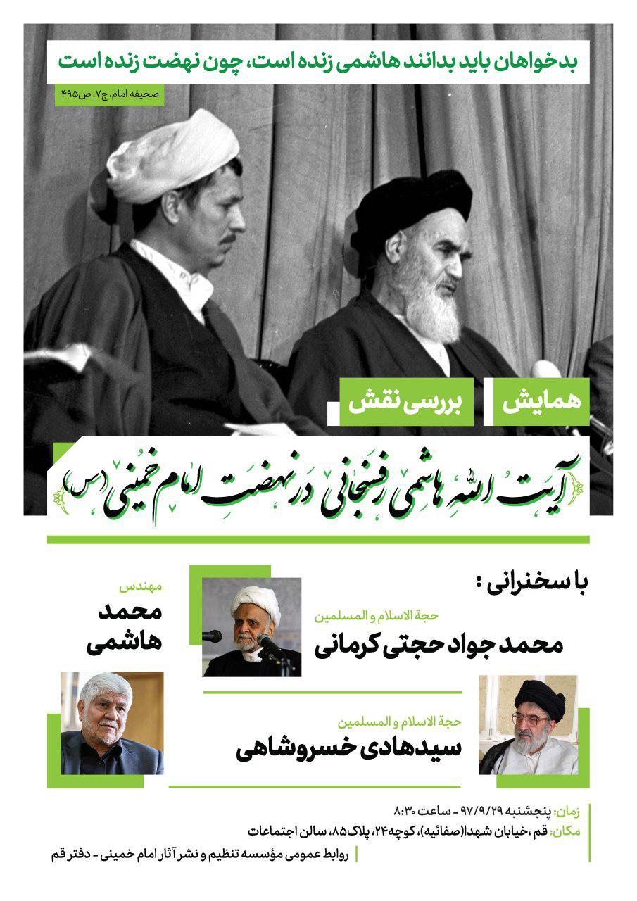 به گزاش جماران، همایش «بررسی نقش آیت الله هاشمی رفسنجانی در نهضت امام خمینی(س)» روز 29 آذر ماه 97 از ساعت 8 و 30 دقیقه صبح در دفتر نمایندگی قم مؤسسه تنظیم و نشر آثار امام خمینی آغاز خواهد شد.