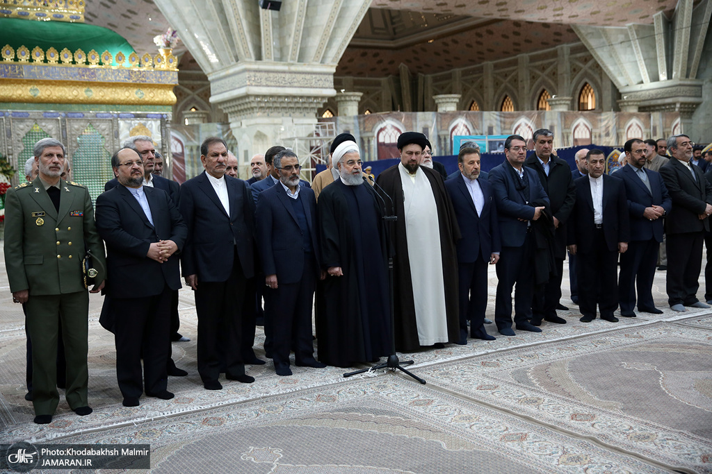 در این مراسم حجتالاسلام والمسلمین سیدحسن خمینی یادگار گرامی حضرت امام و حجت الاسلام و المسلمین محمد علی انصاری، رئیس جمهوری را همراهی می کردند.