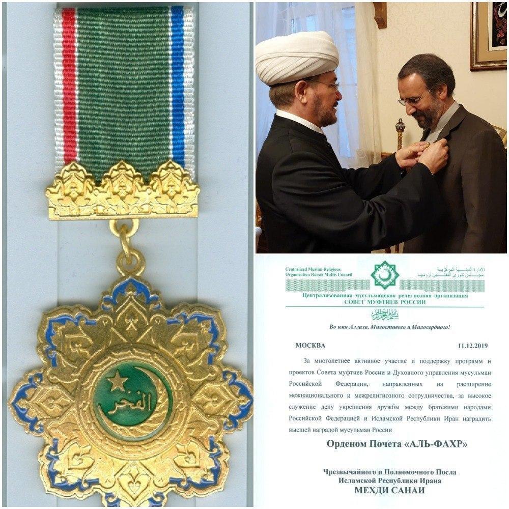 بخاطر سالها مشارکت فعال و حمایت از برنامه ها و طرحهای شورای مفتیان روسیه و اداره دینی مسلمانان روسیه در زمینه گسترش همکاری بین ملیتها و مذاهب، بخاطر خدمات ارزنده جهت تقویت دوستی بین ملل برادر روسیه و ایران، عالیترین جایزه مسلمانان روسیه،
