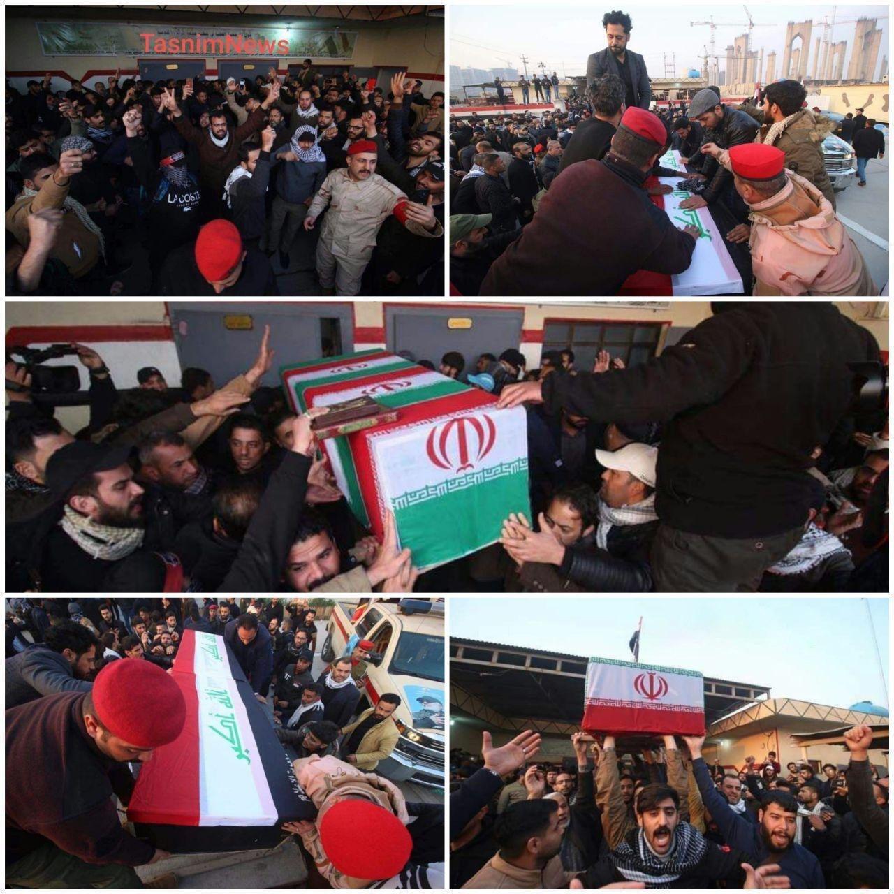مراسم تشییع پیکر سردار قاسم سلیمانی، فرمانده نیروی قدس سپاه پاسداران انقلاب اسلامی ایران و ابومهدی المهندس، معاون رئیس سازمان حشد شعبی و سایر شهدای حشد شعبی امروز (شنبه) از فرودگاه المثنی در بغداد آغاز و وارد شهر کاظمین شد.