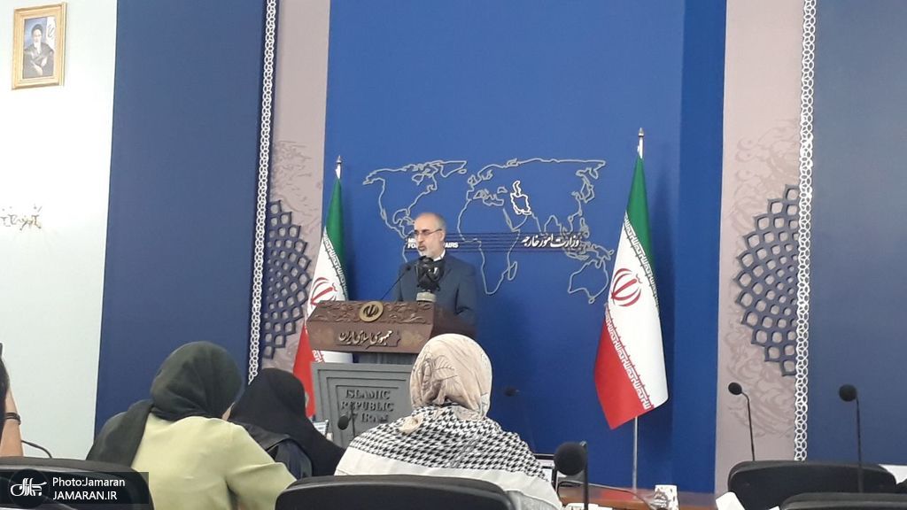 ناصر کنعانی سخنگوی وزارت خارجه با در دست داشتن ماسک ضد شیمیایی به نشست خبری با اصحاب رسانه آمد و ماسک را جلوی تریبون و در معرض دید خبرنگاران قرار داد.