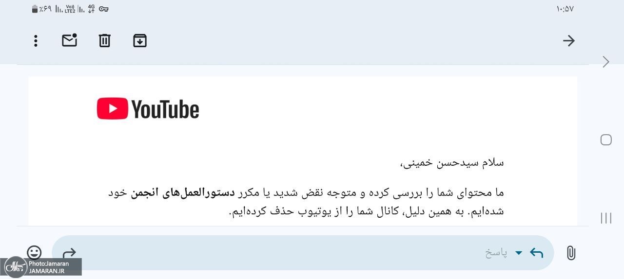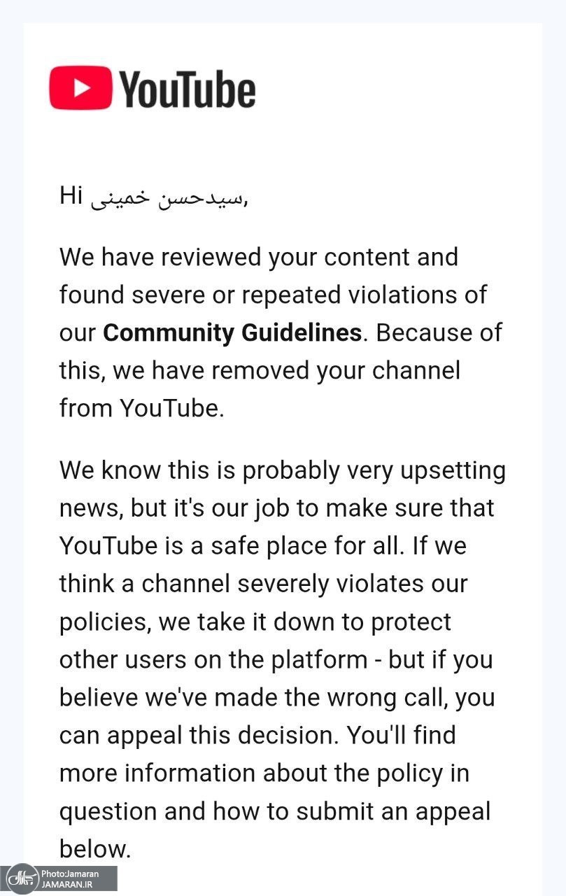 به گزارش خبرنگار جماران، چند وقت گذشته فیلمهای حجتالاسلام و المسلمین سید حسن خمینی در خصوص مسائل غزه، حزب الله لبنان و... در صفحه یوتیوب مورد بازدید بسیاری قرار گرفته بود. به همین دلیل مدیریت یوتیوب پیامی ارسال کرد مبنی بر اینکه «ما محتوای شما را بررسی کرده و متوجه نقض شدید یا مکرر دستورالعملهای انجمن خود شدهایم. به همین دلیل کانال شما را از یوتیوب حذف کردهایم».