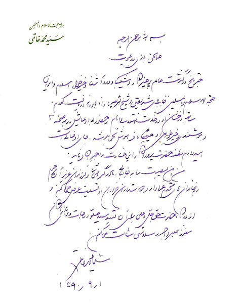 من این مصیبت را به جنابعالی، مادر گرامی شما و فرزندان عزیز آن مرحوم و به خاندان های محترم عزادار و دوستداران فراوان او تسلیت عرض می کنم و از درگاه حضرت حق جّل و علی برای آن فقیذ سعید علّو درجات و برای بازماندگان معزّز صبر و اجر و سلامتی مسئلت می کنم.