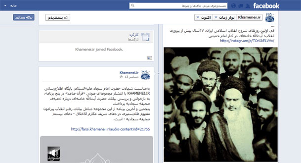 به گزارش پایگاه اطلاع رسانی و خبری جماران، از صبح امروز با ایجاد صفحه khamenei.ir در فیس بوک، اخبار و مطالب مربوط به آیت الله خامنه ای وارد این شبکه بزرگ جهانی شد.