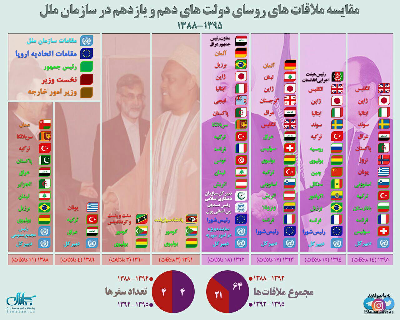 به گزارش جماران، در حاشیه جلسات مجمع عمومی سازمان ملل در سال های1392-1395 و همچنین در سال های 1388-1392 و ملاقات های روسای دولت های دهم و یازدهم در سازمان ملل تعداد سفرهای رئیس دولت دهم و یازدهم هر یک 4 سفر و مجموع ملاقات های محمود احمدی نژاد 21 ملاقات و ملاقات های حسن روخانی 64 عدد بوده است