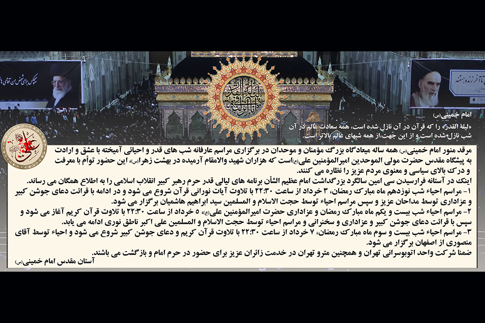 مرقد منور امام خمینی(س) همه ساله میعادگاه بزرگ مؤمنان و موحدان در برگزاری مراسم عارفانه شب های قدر و احیائی آمیخته با عشق و ارادت