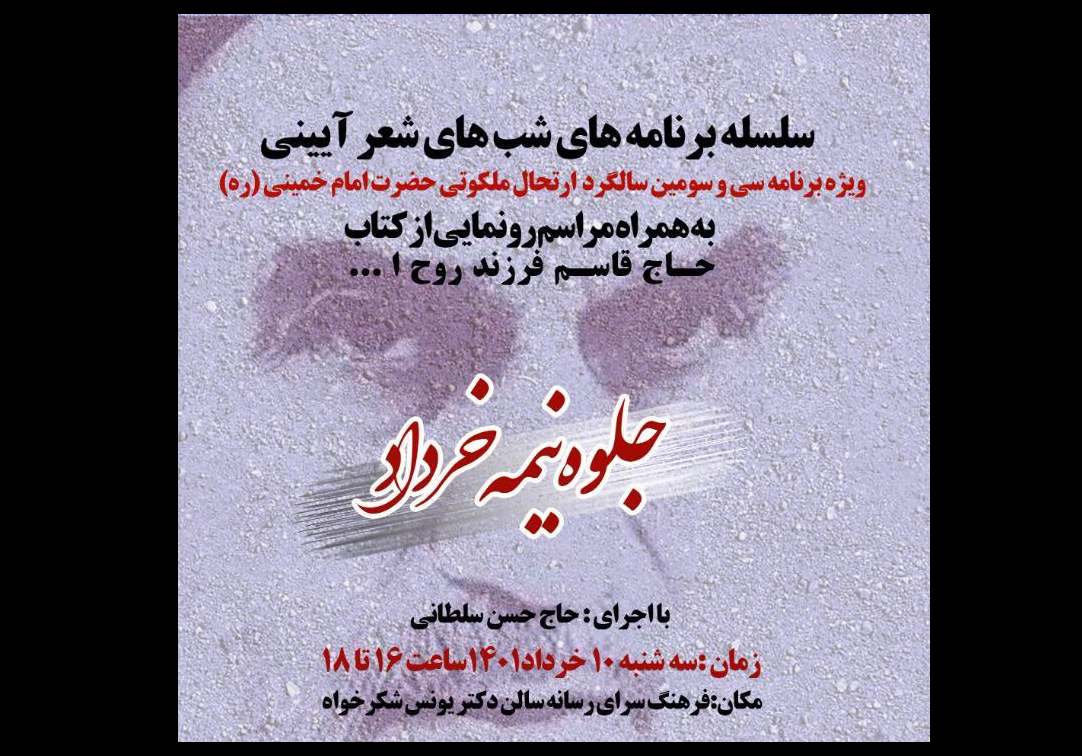 شب شعر «جلوه نیمه خرداد» روز سهشنبه ۱۰ خرداد از ساعت ۱۶ الی ۱۸ در فرهنگسرای رسانه برگزار میشود. حضور برای عموم علاقهمندان با رعایت دستورالعملهای بهداشتی بلامانع است.