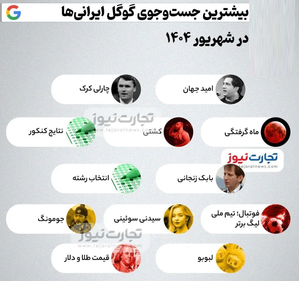به گزارش جماران، در میان بیشترین جستوجوی گوگل ایرانیها در شهریور 1404 ترور چارلی کرک و مرگ امید جهان مورد توجه ایرانیها بود. بزرگترین ماهگرفتگی کامل در گوگل زیاد جستوجو شد و مسابقات کشتی و نتیجه آن برای مردم ایران مهم بود. همچنین به نظر میرسد حرفهای بابک زنجانی از سایر مدیران و مقامات برای مردم جالبتر بوده است.
