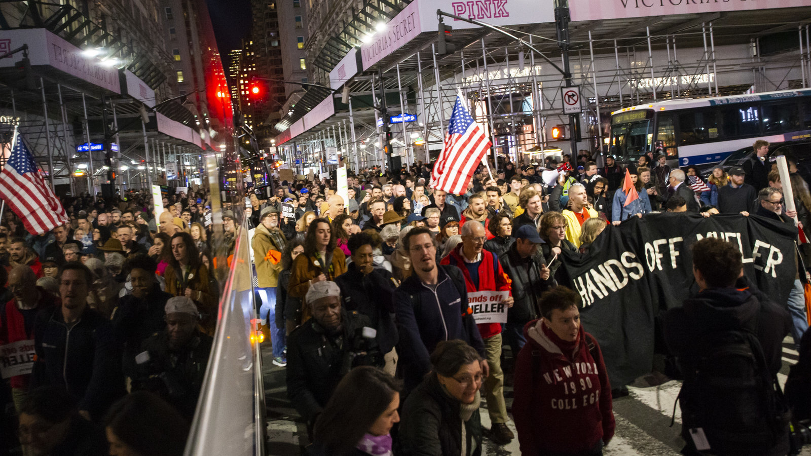 تظاهرکنندگان به دخالت های دولت ترامپ در تحقیق درباره نقش روسیه در انتخابات آمریکا اعتراض و مخالفت خود را با تلاش های دولت آمریکا برای بر هم زدن تحقیقات «رابرت مولر» بازپرس ویژه و مسئول تحقیق درباره دخالت روسیه در انتخابات آمریکا اعلام کردند.