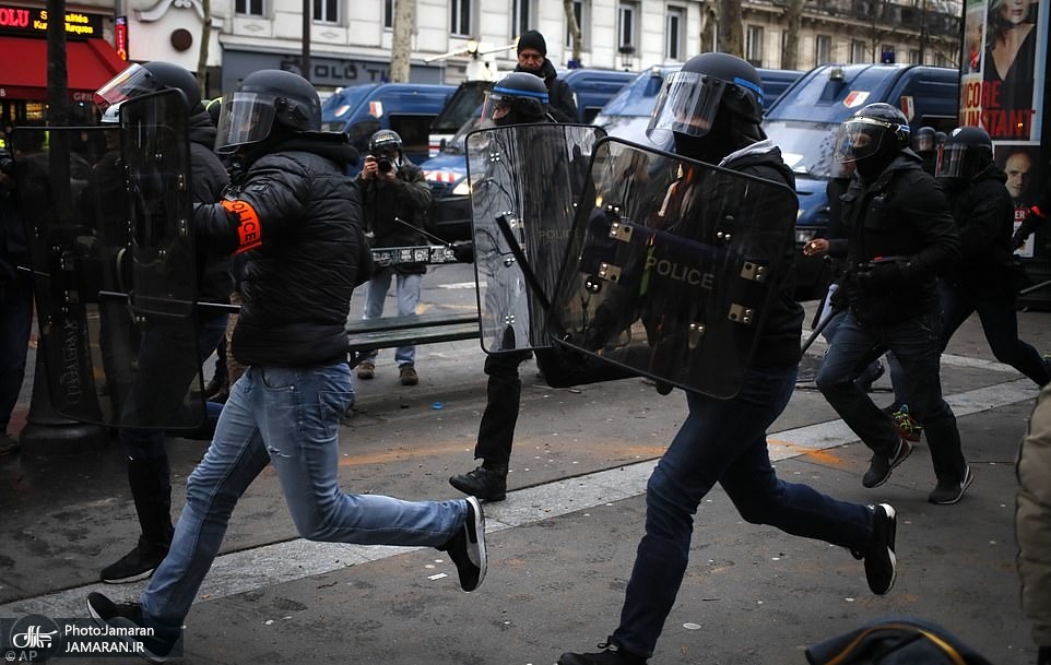 نیروهای پلیس ضد شورش برای دور کردن و متفرق کردن معترضان از گاز اشک آور و کامیون آب پاش استفاده کردند. برخی از راهپیمایان نیز سنگ و دیگر اشیایی را که در دسترس داشتند به طرف پلیس پرتاب کردند. راهپیمایان در آن حال و در میان ابر غلیظی از گاز اشک آور همچنان شعار می دادند: «پلیس، همه از تو متنفرند» و «ماکرون، استعفا».