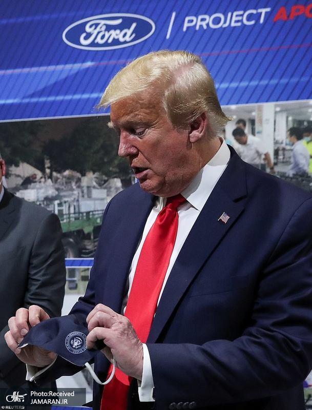 ترامپ در ماسکی به رنگ آبی تیره ظاهر شد. در کنار ماسک یک نشان طلایی ریاست جمهوری قرار داشت.
