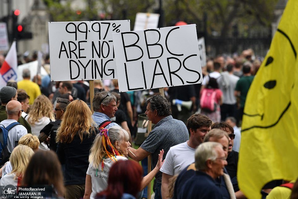 معترضانی که امروز از اقصی نقاط انگلیس در میدان پارلمان لندن تجمع کردند، شعارنوشته‌ هایی را حمل می‌ کردند که روی آن عبارت‌ هایی مانند «بدن من مال من است»، «آزادی قابل مذاکره نیست»، «ما خوک های گینه نیستیم»، «دروغگوهای بی بی سی» و «نه به واکسن کووید 19» نوشته شده بود.