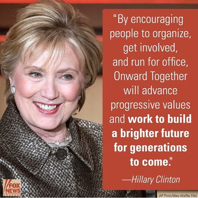 هیلاری کلینتون با هدف اعمال فشار بر «دونالد ترامپ» رئیس جمهور آمریکا برای بازبینی برنامه خود برای تغییر محیط سیاسی این کشور، سازمان جدیدی را تحت عنوان «همه با هم به پیش» تاسیس کرده است که از فعالیت مدنی حمایت، و مقاومت سیاسی را ترغیب خواهد کرد.