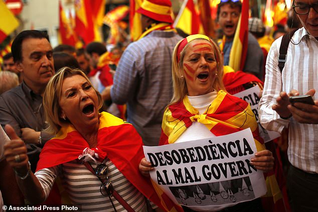 آنها با در دست داشتن پرچم های اسپانیا و کاتالونیا به برنامه سران جدایی‌طلب مبنی بر اعلام استقلال اعتراض کردند.