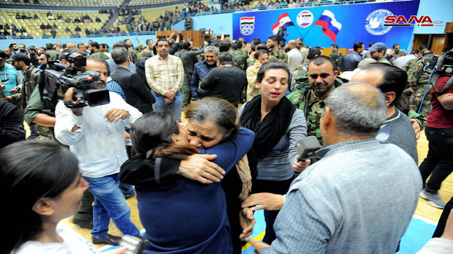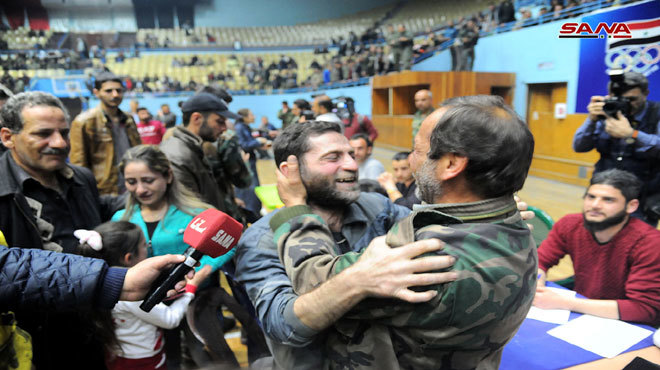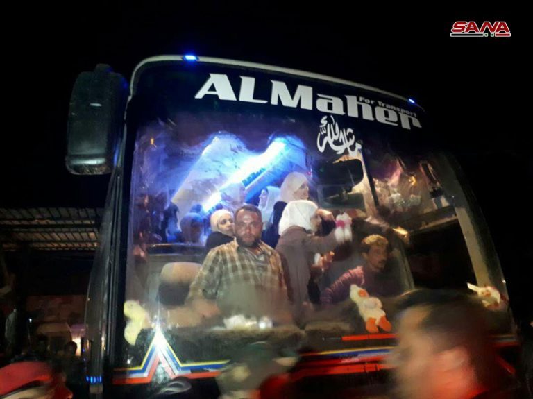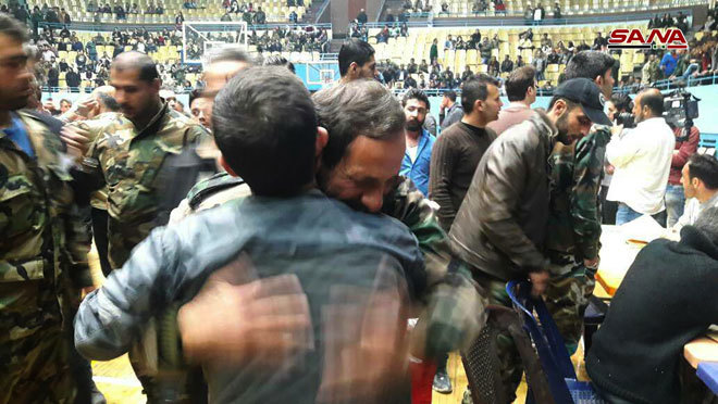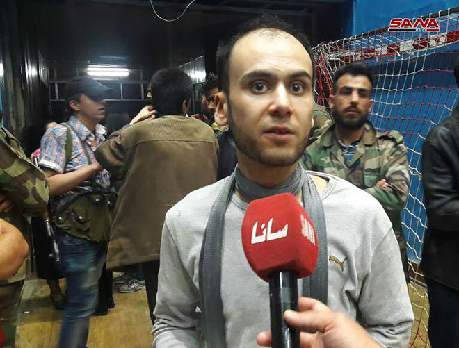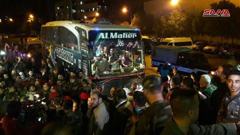 خبرنگار سانا در گذرگاه الوافدین گفت که در حدود ساعت یازده شب گذشته یک اتوبوس حامل ده ها شهروند ربوده شده که توسط جیش الاسلام آزاد شدند و بیشتر آنها کودک و زن هستند از طریق گذرگاه الوافدین از شهر دوما خارج شدند و پس از آن به سالن«الفیحا» در شهر دمشق منتقل شدند؛ همان جایی که هزاران شهروند سوری و خانواده های این شهروندان آزاد شده در انتظار آنها بودند.