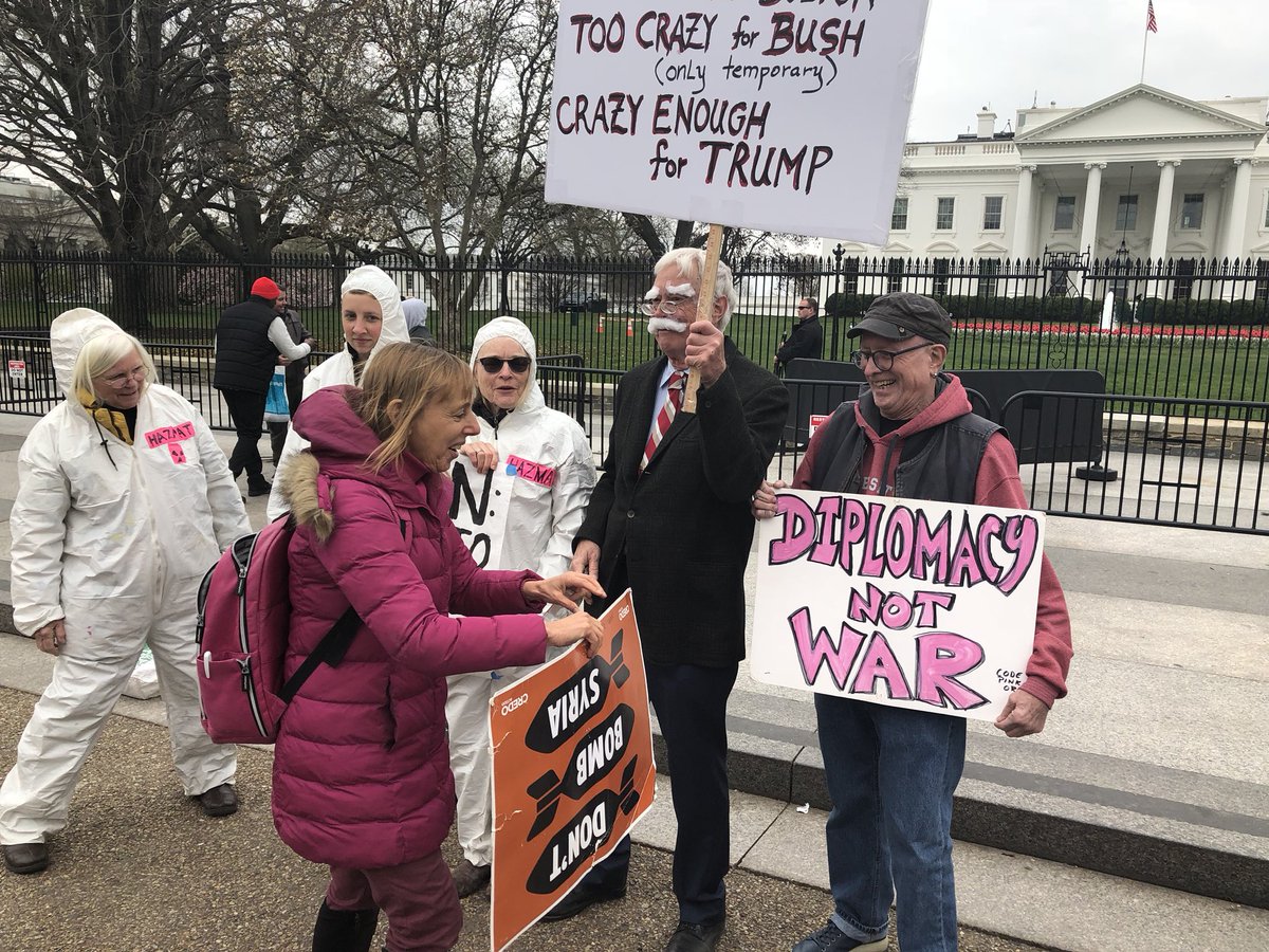 آنها پلاکاردهایی در دست داشتند که بر روی آنها نوشته شده بود: «دیپلماسی، نه جنگ» و «جان بولتون، بسیار دیوانه برای دولت بوش؛ بسیار دیوانه برای دولت ترامپ».