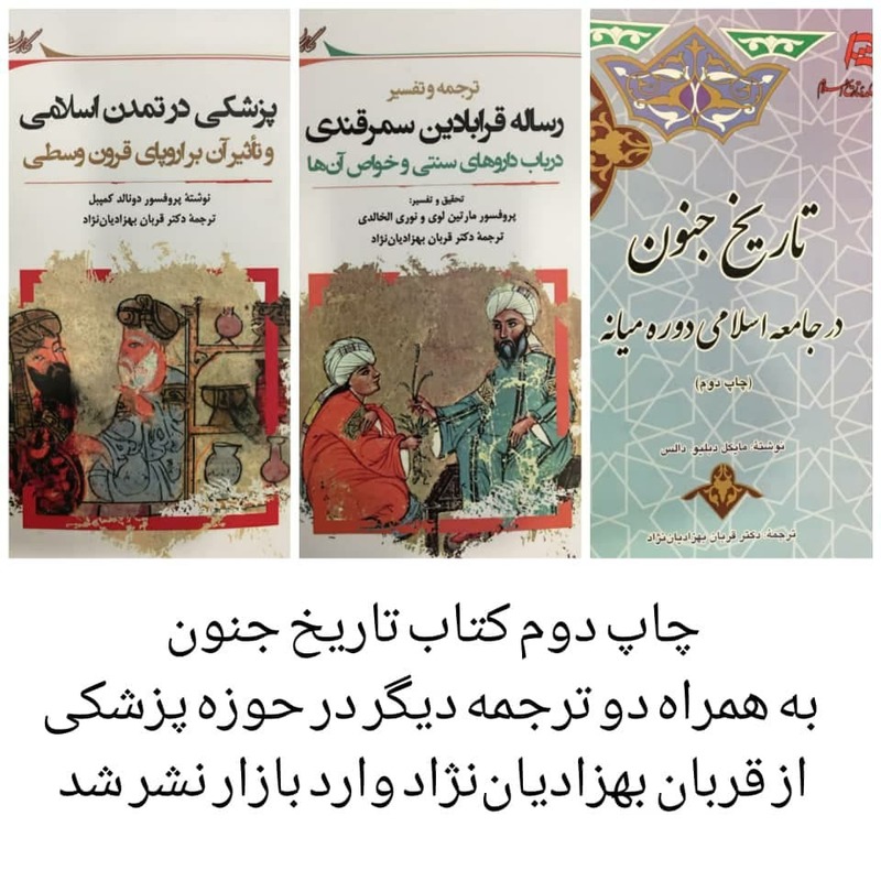 همزمان با چاپ دوم کتاب تاریخ جنون توسط انتشارات پژوهشکده تاریخ اسلام، دو کتابِ دیگر؛ «پزشکی در تمدن اسلامی» و «رساله قرابادین سمرقندی» که هر دو آثار به ترتیب اثر پروفسور دونالد کمپبل و پروفسور مارتین لوی و نوری الخالدی است، به ترجمه دکتر قربان بهزادیاننژاد توسط انتشارات نگارستان اندیشه به بازار نشر آمد.