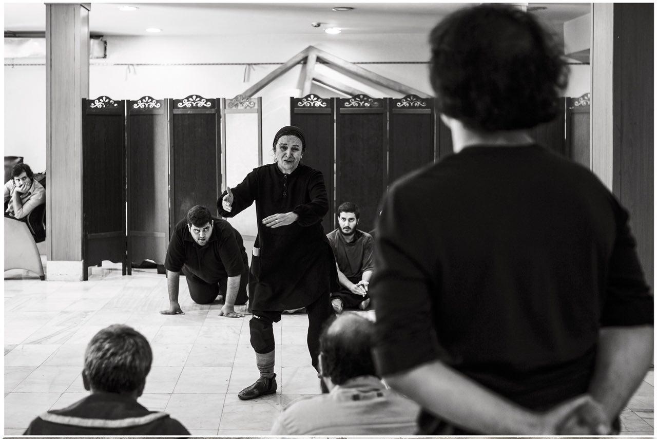 در گوشه‌ای روی اولین صندلی خالی می‌نشینم. افشین هاشمی که آرام‌ و قرار ندارد و پُر انرژی از این سو به آن سو می‌رود، خود نقش خان‌بابا را بر عهده دارد اما به نظر می‌رسد حالا مشغول فیکس کردن میزانسن‌ بازیگران است و خواندن تک‌بیت‌های نقشش را به منشی‌صحنه‌اش داده.