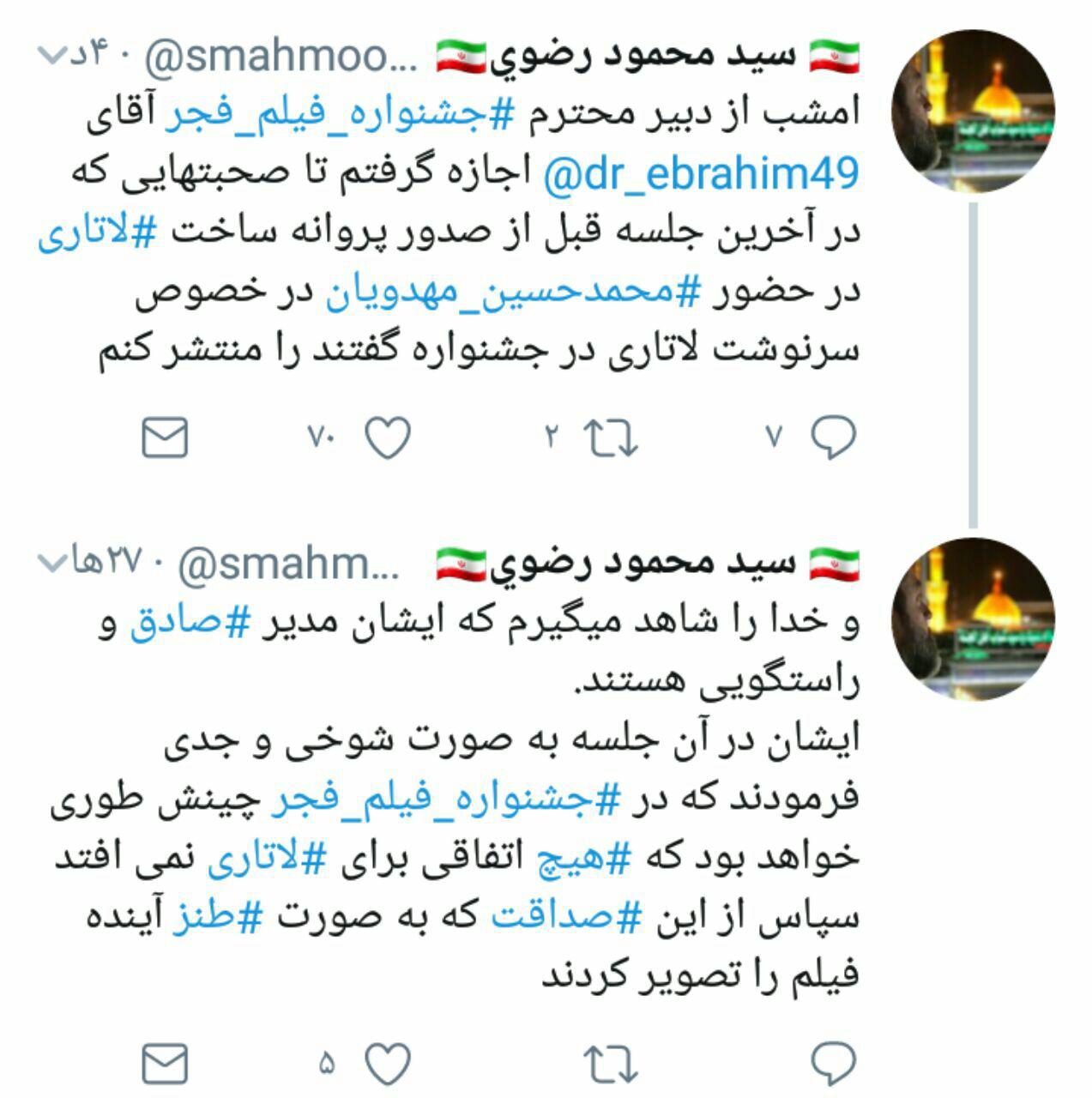 به گزارش جی پلاس، سیدمحمود رضوی، تهیه کننده فیلم " لاتاری" توئیت جالبی درباره چینش جوایز جشنواره فیلم فجر منتشر کرد.