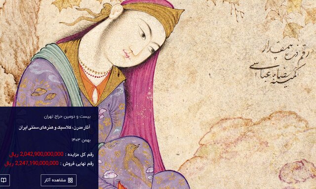 بر اساس پیش بینیها، عنوان گرانترین اثر فروخته شده در این حراجی، به تابلوی نگارگری از رضا عباسی تعلق گرفت که ۲۲ میلیارد و ۴۴۰ میلیون تومان فروخته شد. با این همه، در اظهارنظری پس از برپایی حراجی، مدیرکل موزههای وزارت میراثفرهنگی، گردشگری و صنایع دستی گفته است، فروش تابلوی «پرتره دختر نشسته» غیرقانونی است.
