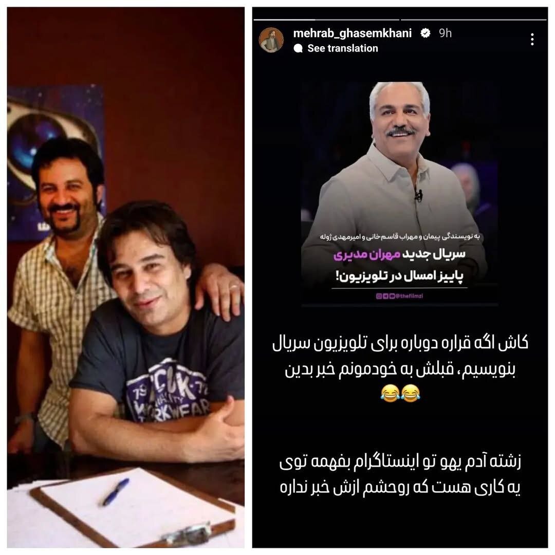 به گزارش جماران، مهراب قاسم خانی با انتشار یک استوری راجع به شایعه همکاری خودش و پیمان قاسم خانی با مهران مدیری و برای ساخت یک سریال تلویزیونی، نوشت: کاش اگه قراره دوباره برای تلویزیون سریال بنویسیم، قبلش به خودمونم خبر بدین...زشته آدم یهو تو اینستاگرام بفهمه تو یه کاری هست که روحشم ازش خبر نداره...