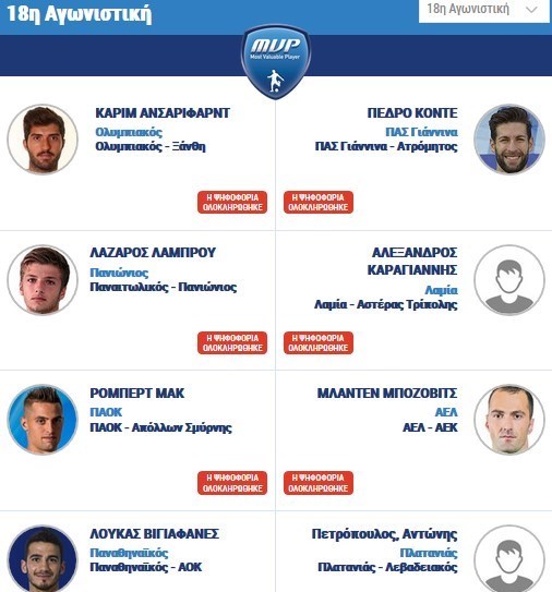 به گزارش جی پلاس، سایت نوا اسپورت، حامی رسانهای سوپر لیگ یونان اسامی هشت نامزد دریافت جایزه 5 هزار یورویی بهترین بازیکن هفته هجدهم سوپر لیگ یونان را منتشر کرد که نام کریم انصاریفرد، ملیپوش ایرانی تیم المپیاکوس آتن در ردیف نخست دیده میشود.