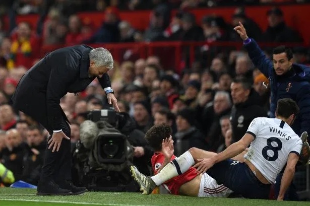 خطای وینکس بازیکن تاتنهام منجر به برخورد سر جیمز بازیکن جوان منچستر با پای مورینیو شد!