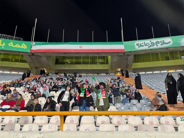 تماشاگران زن ایرانی نیز در ضلع جنوبی ورزشگاه مستقر شده‌اند و رفته رفته بر تعداد آن‌ها افزوده می‌شود.