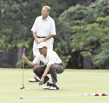 اوباما؛ ورژن گلفباز پیش از راکت - تنیس، اوباما چوب گلف به دست گرفته بود تا روی دیگری از تواناییهای ورزشیاش را به نمایش بگذارد. او که چند هفته پیش به یکی از کمپهای نظامی آمریکا در کشورهای همسایه سفر کرده بود، هوس بازی گلف میکند و به زمین گلف کمپ نظامی نیروی دریایی آمریکا میرود، آن هم غافل از اینکه دو فرمانده نظامی ارتش در زمین مجاور جشن عروسیشان را برگزار میکنند. نیروهای امنیتی برای اینکه سلامت رئیس جمهور تهدید نشود، عروسی را به تعویق میاندازند تا بازی گلف باراک اوباما انجام شود. اوباما که بعداً از این موضوع مطلع میشود، با تلفن به گوشی داماد زنگ میزند و رسماً از آنها عذرخواهی میکند. او برای این زوج جوان که گوشیشان را روی اسپیکر گذاشته بودند و از خوشحالی در پوست خود نمیگنجیدند، آرزوی خوشبختی کرد. البته این تنها باری نبود که اوباما گلف بازی کرده است؛ او هر وقت فرصت پیدا کند، افراد رده بالای دولتی را به این بازی دعوت میکند.