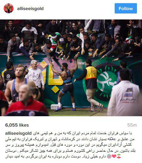 به گزارش جی پلاس، قهرمان نامدار آمریکا و دارنده مدال طلای المپیک 2012 با ارسال تصویری در صفحه اینستاگرام خود گفت: " با سپاس فراوان خدمت مردم ایران که به من و هم تیمی های من عشق و علاقه بسیار نشان دادند در کرمانشاه و تهران و تبریک فراوان به تیم ملی کشتی آزاد ایران می گویم در این دوره و دوره های قبل. امیدوارم همیشه پیروز و سربلند باشین. در حال حاضر راهی کشورم هستم و برای همه چیز تشکر میکنم."