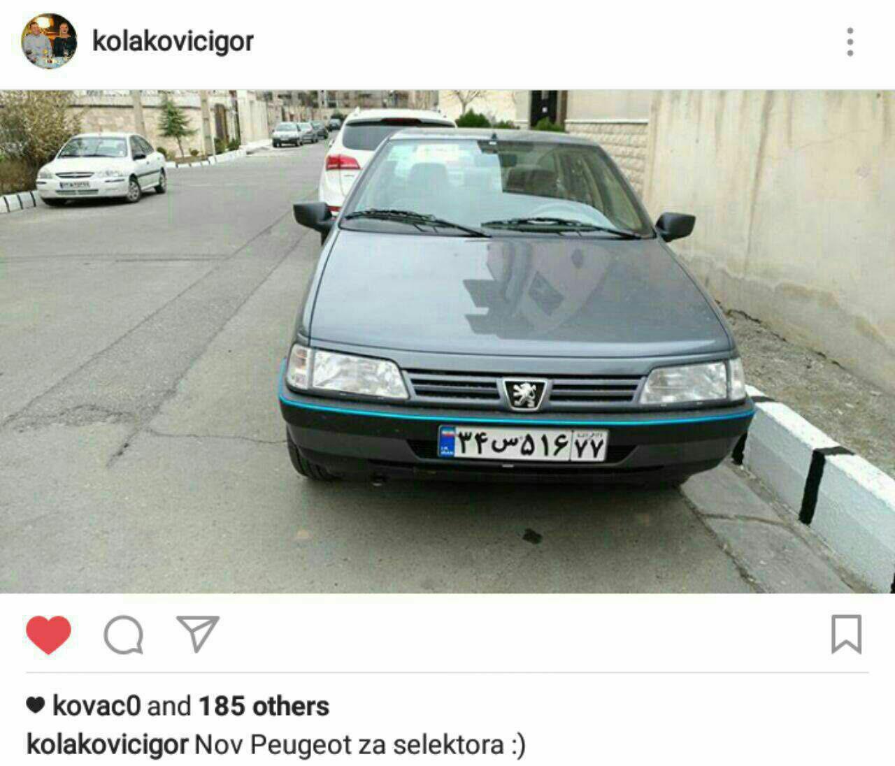کولاکوویچ با انتشار عکسی از خودروی اختصاصی اش در ایران نوشت: « پژو؛ ماشین اختصاص یافته به من.»